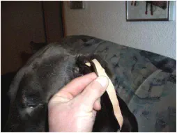 Als dritten Schritt klebt man ein Pflasterstück an den vorderen Ohrrand in das Ohr, so wie im Foto zu sehen.