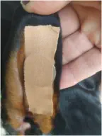 So sieht es fertig geklebt von vorne aus. Alle 2-3 Tage sollte man die Ohren reinigen, da sie sich sonst entzünden könnten. Man schneidet das Klebeband einfach unten auf, säubert die Ohren und lässt alles eine Zeit lang offen. So kann man auch sehen, wann der Hund die Ohren korrekt trägt. Das Klebeband erst von den Ohrrändern entfernen, wenn es sich von alleine löst oder wenn die Ohren korrekt sind. Stellt der Hund die Ohren immer noch nach oben, dann einfach die losen Enden wieder zusammen kleben. Manchmal braucht man einfach Geduld und manchmal sind recht schnell Erfolge sichtbar. In jedem Fall führt diese Vorgehensweise sicher zum gewünschten Erfolg!Zum entgültigen lösen des Klebebandes sollte man Äther in der Apotheke holen oder Waschbenzin verwenden und danach das Ohr waschen.Aber bitte die Lösungsmittel nicht in die Augen, Ohren oder Nase/Maul kommen lassen.VORSICHT ist hier geboten!
